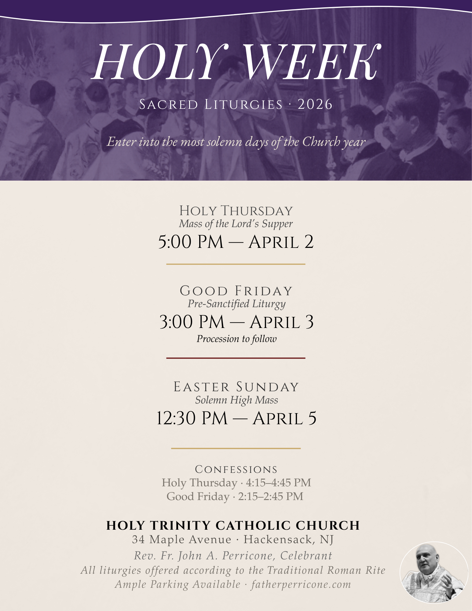 Easter Sunday - Solemn High Mass Sunday, April 5, 2026 12:30 PM 2:00 PM Holy Trinity Catholic Church 34 Maple Avenue Hackensack, NJ, 07601 United States (map) Google Calendar ICS